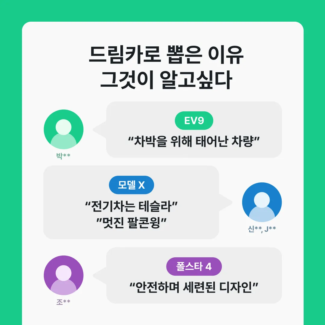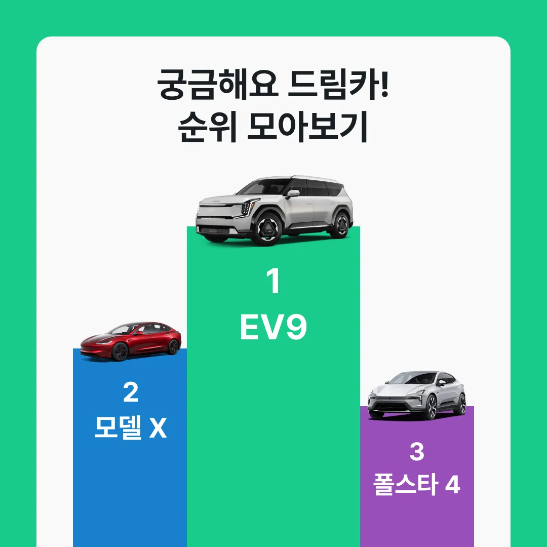 실제로 타고 계시는 차와 비교해 봤을 때 드림카는 상대적으로 가격이 높은 편이었어요. TOP3 드림카를 예로 든다면 상대적으로 가장 가격대가 낮은 폴스타 4가 6-7000만 원대거든요.(네*버 기준) 만약 가격이 높은 전기차가 아니라면 주행거리가 길거나 출력이 강하다는 특장점을 갖고 있었답니다.