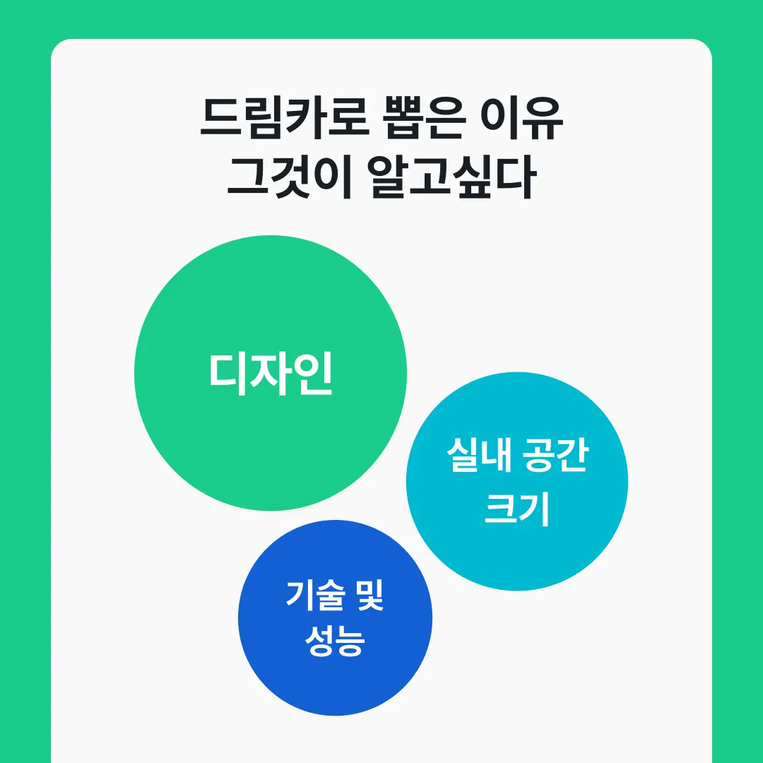 마지막으로 회원님들이 드림카를 선택하는 이유를 전반적으로 훑어봤어요. 대부분의 회원님들은 하나의 이유를 들기보다는 여러 이유를 함께 말씀해 주셨는데요. 저희가 임의로 항목들을 구분해보았는데 그 결과, 이미지처럼 3가지 항목에 대한 언급이 많았어요. 그중에서도 “디자인”과 관련된 언급이 전체 답변 중 28%가량을 차지하며 가장 많았답니다. ‘드림카’하면 역시 멋진 디자인, 이미지의 차량이 가장 먼저 떠오르는 것 같아요.