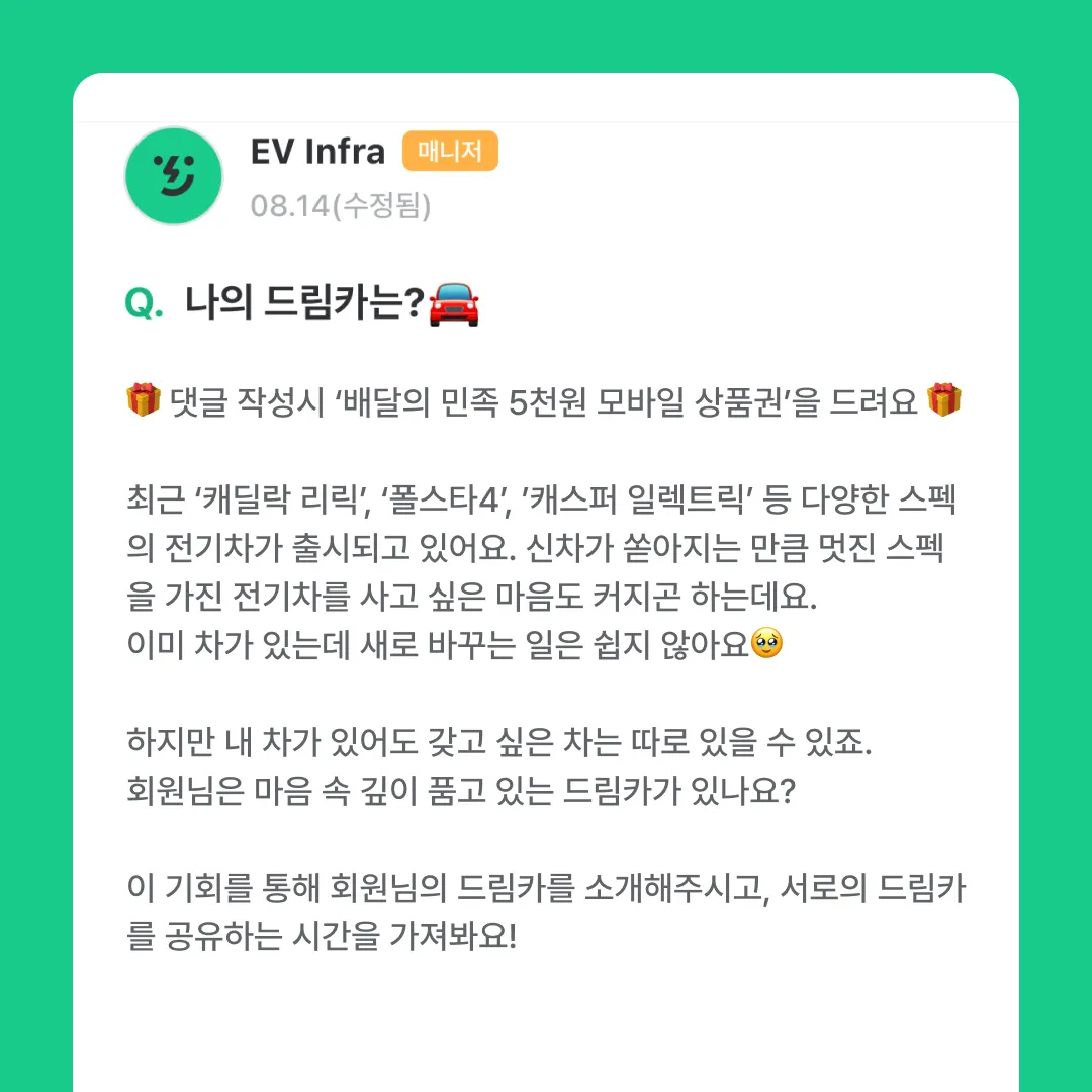 ’ 게시글에 회원님들이 남겨주신 댓글을 가공해 구성해 봤어요! EV Infra 회원님의 전체 데이터가 아닌 이벤트에 참여해주신 회원님의 답변만 분석한 데이터예요. 이벤트에 참여해 주신 회원님들 다시 한번 진심으로 감사드리고, 재밌게 봐주세요!