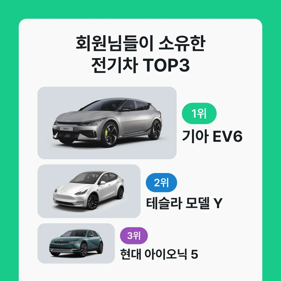가장 먼저, 회원님들이 갖고 계신 전기차는 무엇인지 질문을 드렸었어요. 정말 다양한 차종을 말씀해 주셨는데 그중에서도 가장 많았던 1위는 바로 ‘기아 EV6’였습니다. 그다음으로는 테슬라 모델 Y가 2위, 현대 아이오닉 5가 3위를 차지했어요. 하지만 1, 2, 3 순위는 각각 3%라는 근소한 차이를 보였답니다.
