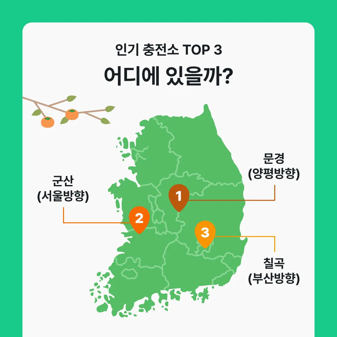 인기 충전소 TOP3 이번에는 위치로 확인해 볼게요! 1위 군산휴게소(서울방향), 2위 문경휴게소(양평방향) 모두 상행 방향 휴게소네요. 3위는 칠곡휴게소(부산방향)로 하행 방향 휴게소인데요.