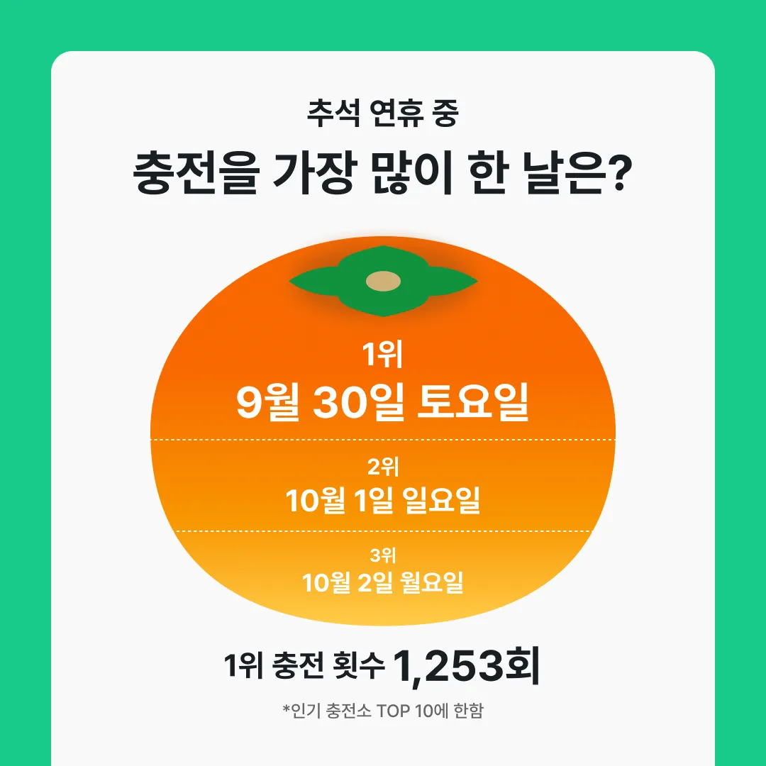 마지막으로 추석 연휴 기간 동안 충전을 가장 많이 한 날짜를 알아봤어요. TOP10 기준으로 1위는 9월 30일 토요일이었답니다. 그 다음으로는 10월 1일 일요일이 1,192회, 10월 2일 월요일 1,178회로 각각 2위, 3위였어요.