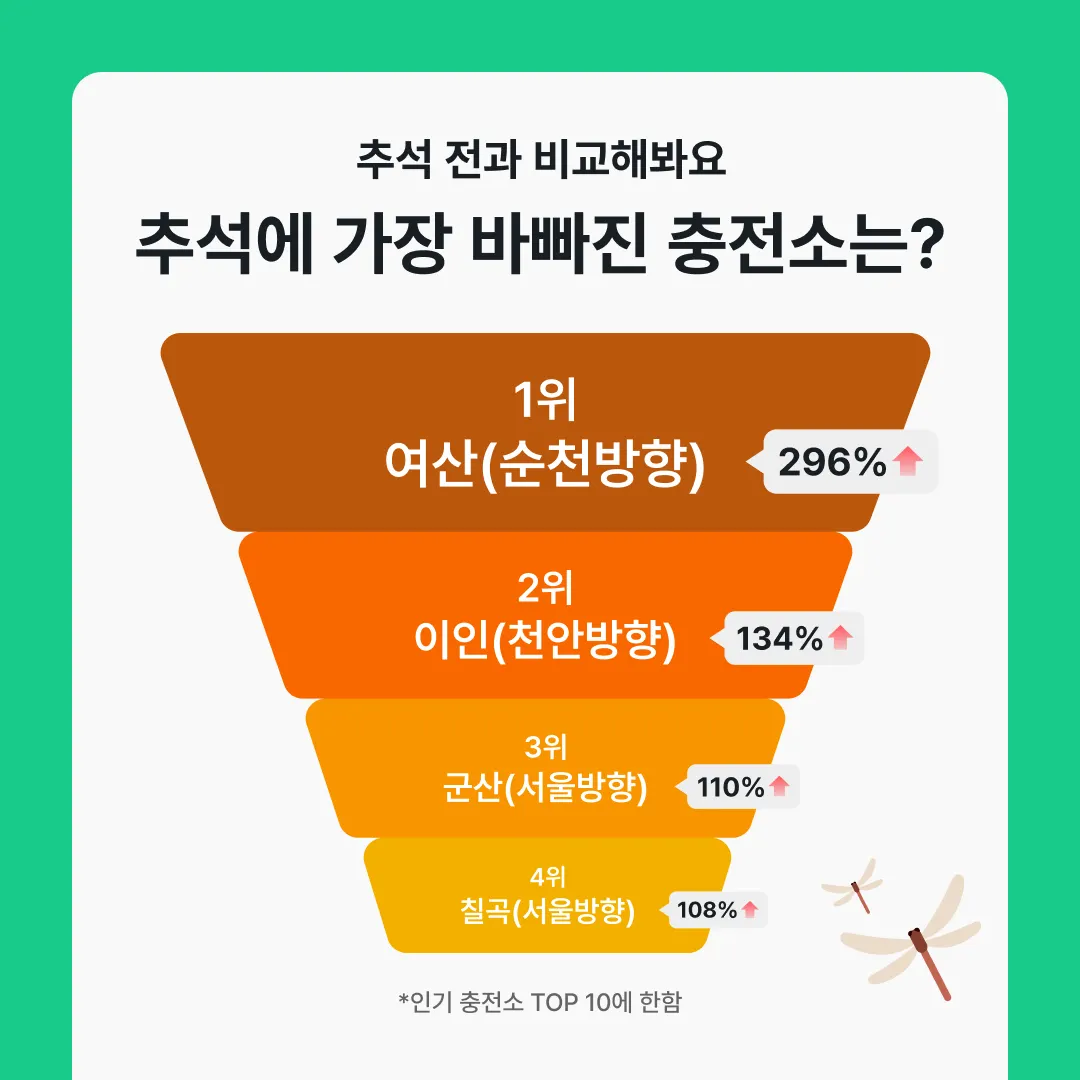 그렇다면 추석 전보다 추석 동안에 “훨씬” 바빠진 충전소는 어디일까요?.1위는 바로 여산휴게소(순천방향)예요. 추석 전에는 1일 평균 22회, 추석 기간 동안에는 1일 평균 91회 충전이 이루어져 무려 296%라는 증가율을 보였어요!