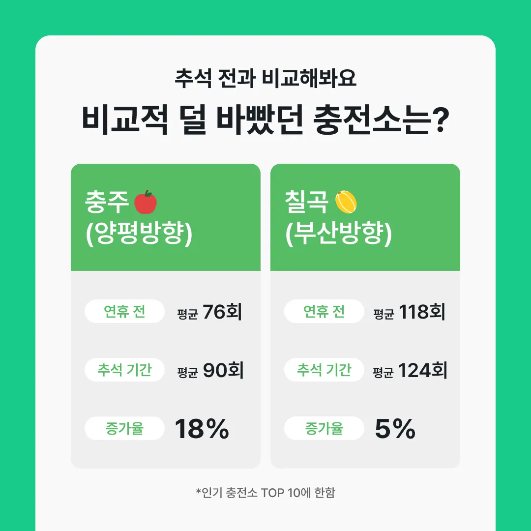 반대로 비교적 “추석에 평소보다 덜 바빴던” 충전소는 칠곡휴게소(부산방향)였어요. 칠곡휴게소(부산방향)은 연휴 전에도 이미 118회로 충전 횟수가 많은 편이었거든요. 추석 기간 동안에는 하루 평균 충전 횟수 124회로 추석 전과 크게 달라지지 않았답니다. 그러니 비교적 낮은 증가율로 추석도 평소와 비슷하게 바빴다고 볼 수 있겠어요.