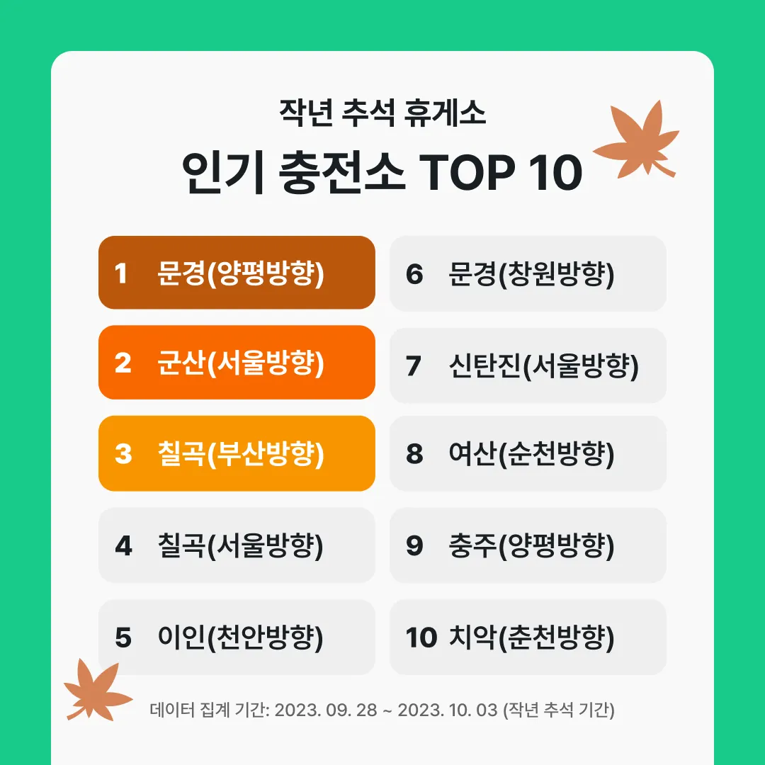 TOP10에 든 휴게소가 대부분 상행 방향인데, 칠곡휴게소는 하행 시 특히 많이 이용하는 휴게소라고 볼 수 있겠어요. 인기 충전소 TOP10에 대한 자세한 정보가 궁금하신 분들은 아래 화살표를 눌러주세요