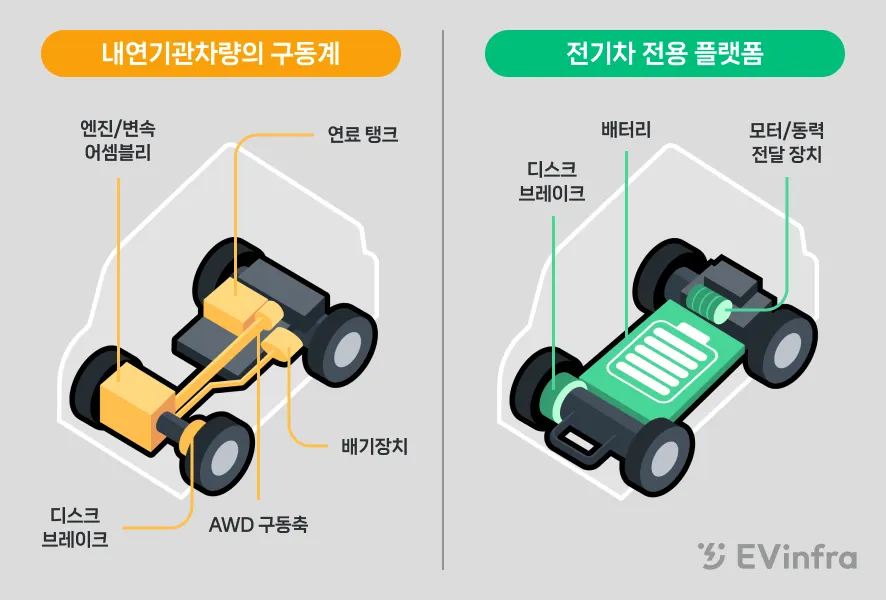 주행 성능, 연비, 승차감, 안전성, 실내 공간, 디자인 등에 영향을 미쳐 차량의 경쟁력을 결정하기도 해요. 그래서 많은 차량 제조사가 자체 전기차 전용 플랫폼 개발에 심혈을 기울이고 있어요.