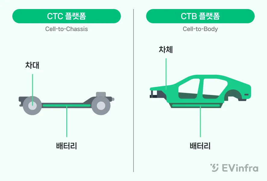 CTC 플랫폼은 배터리 셀이 차의 샷시, 즉 차대가 되는 형태를, CTB 플랫폼은 배터리 셀이 차체가 되는 형태를 말해요.