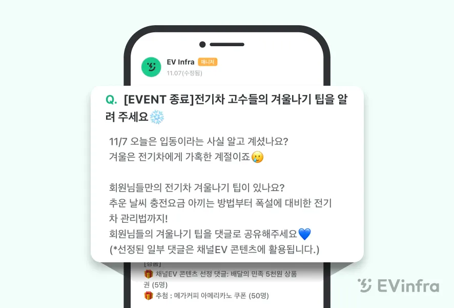 지난 8일부터 12일까지, 카뮤니티 질문해요 게시판에서 회원님들께 전기차 겨울나기 팁을 받아 보았어요. 직접 전기차를 운행 중이신만큼 좋은 팁이 정말 많았는데요! 그 중 일부를 소개해보고자 해요.
