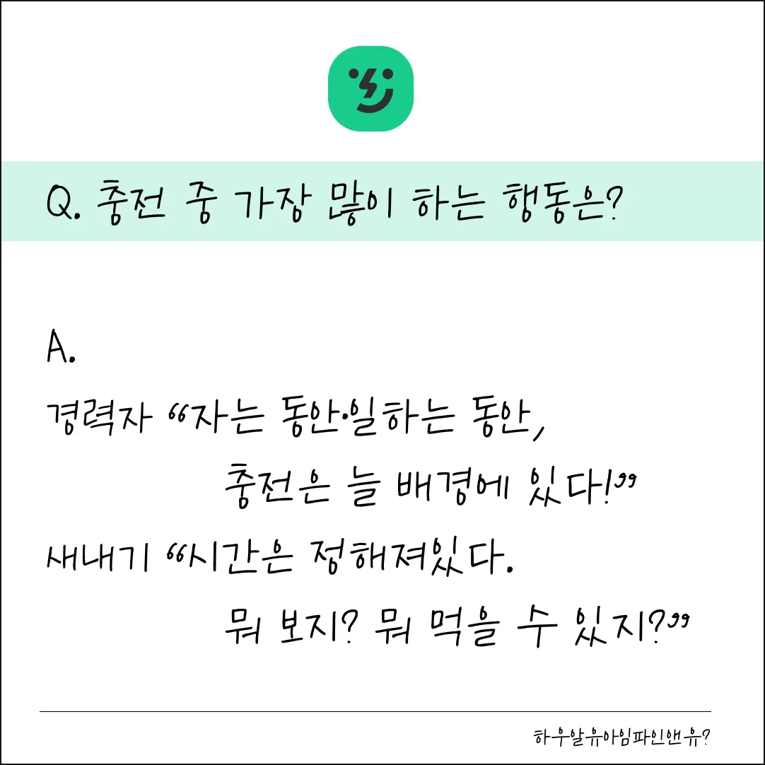 일상 속에서 자연스럽게 충전을 하다보니 따로 충전시간에 특별한 일을 하지는 않는것같아요.