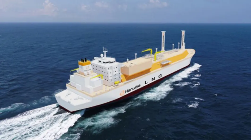 먼저 한화오션은 최신 기술을 탑재한 4대를 전시했어요. 그중 온실가스 배출량을 줄인 그린십(Greenship) 사양이 적용된 'LNG 운반선'이 돋보였습니다. LNG 선은 말 그대로, 액화천연가스(LNG)를 수송하는 선반이에요. 선박 주변 바람과의 압력차로 추진력을 얻어 연료 소모량과 탄소 배출을 줄이는 로터 세일과, 화석연료 사용 시 발생하는 이산화탄소를 모으는 탄소포집창 등의 친환경 기술을 적용했다고 해요. 세계에서 운항 중인 LNG 운반선 중 1/4이 한화오션이 건조한 것이라는 사실 아셨나요? LNG 운반선은 한화오션의 주력 제품으로서 이미 세계 시장 점유율 1위를 기록했고, 그 입지를 더욱 단단히 세우는 중이랍니다.