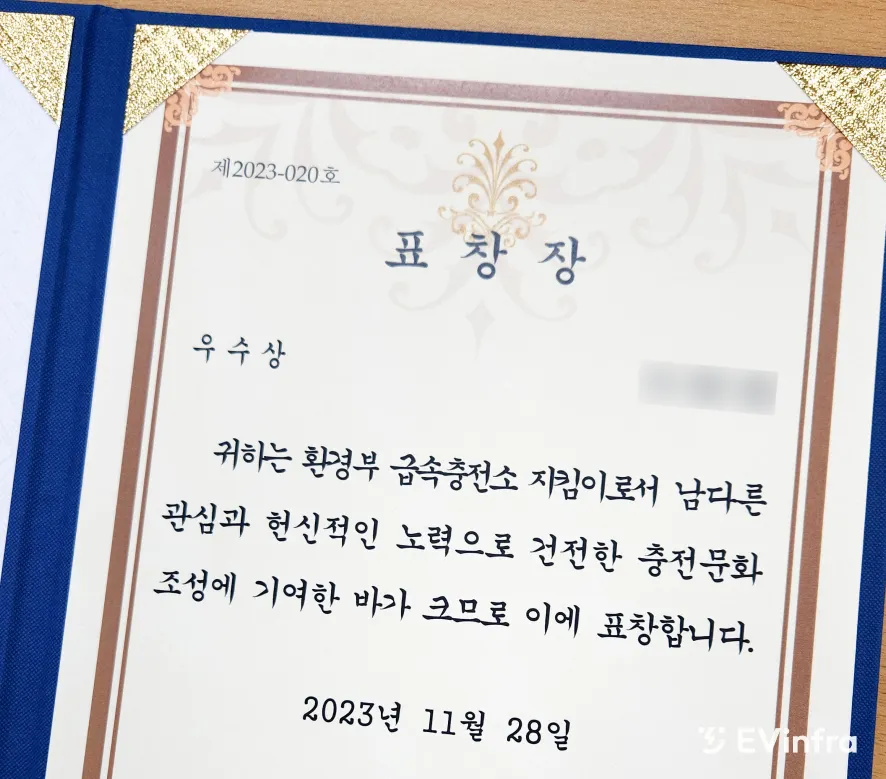 제가 포항 지역의 충전소는 거의 다 남겼죠. 어디를 가더라도 주변에 충전소가 있는지 보고, 있으면 사진 찍어두고. 그게 습관이 됐어요. 이제 폰 갤러리를 보면 가족 사진보다 충전소 사진이 더 많아요. 상도 받았어요. 우수 충전소지킴이로 표창장을 받아 기분이 무척 좋았습니다.