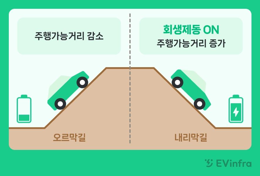 전기차 주행거리 문제, 회생제동을 활용하면 좋은데요. 특히 시내처럼 감속이 활발한 구간에서 회생제동을 활용하면 주행거리를 안정적으로 유지할 수 있어요. 또 내리막길에서도 좋은데요. 이해를 위해 산길을 예로 들어볼게요. 산길 오르막길을 주행할 때는 강한 동력이 필요해 에너지도 많이 소모되고 그에 따라 예상 주행가능거리가 줄어들 수 있어요.