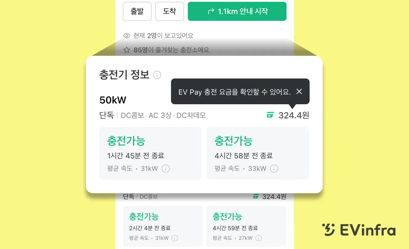 충전소 상세 화면에서 충전 요금, 충전 속도, 사용 가능 여부를 확인해보세요!