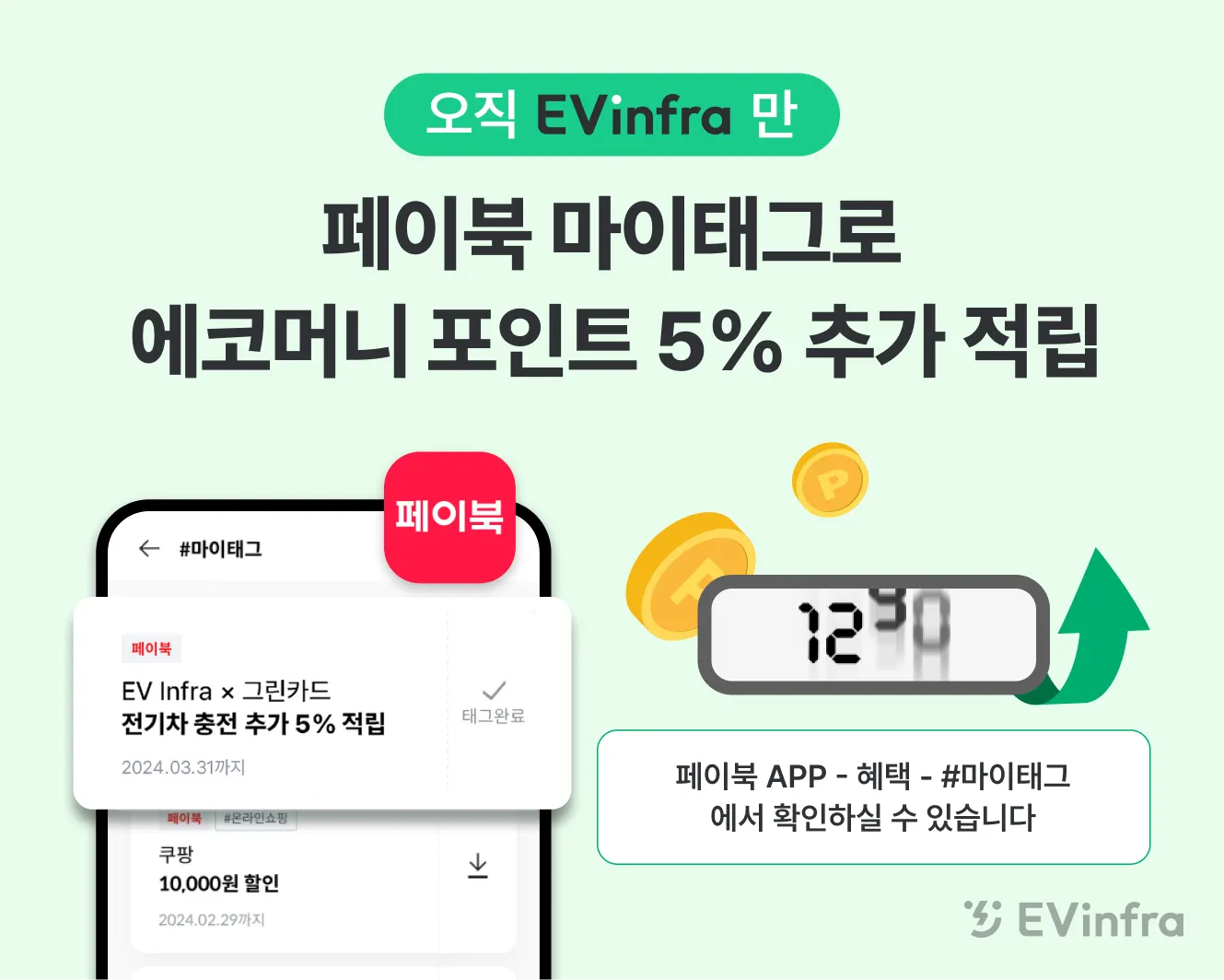 혜택 셋. 오직 EV Infra만! 페이북 #마이태그 적용 시 에코머니 포인트 5% 추가 적립