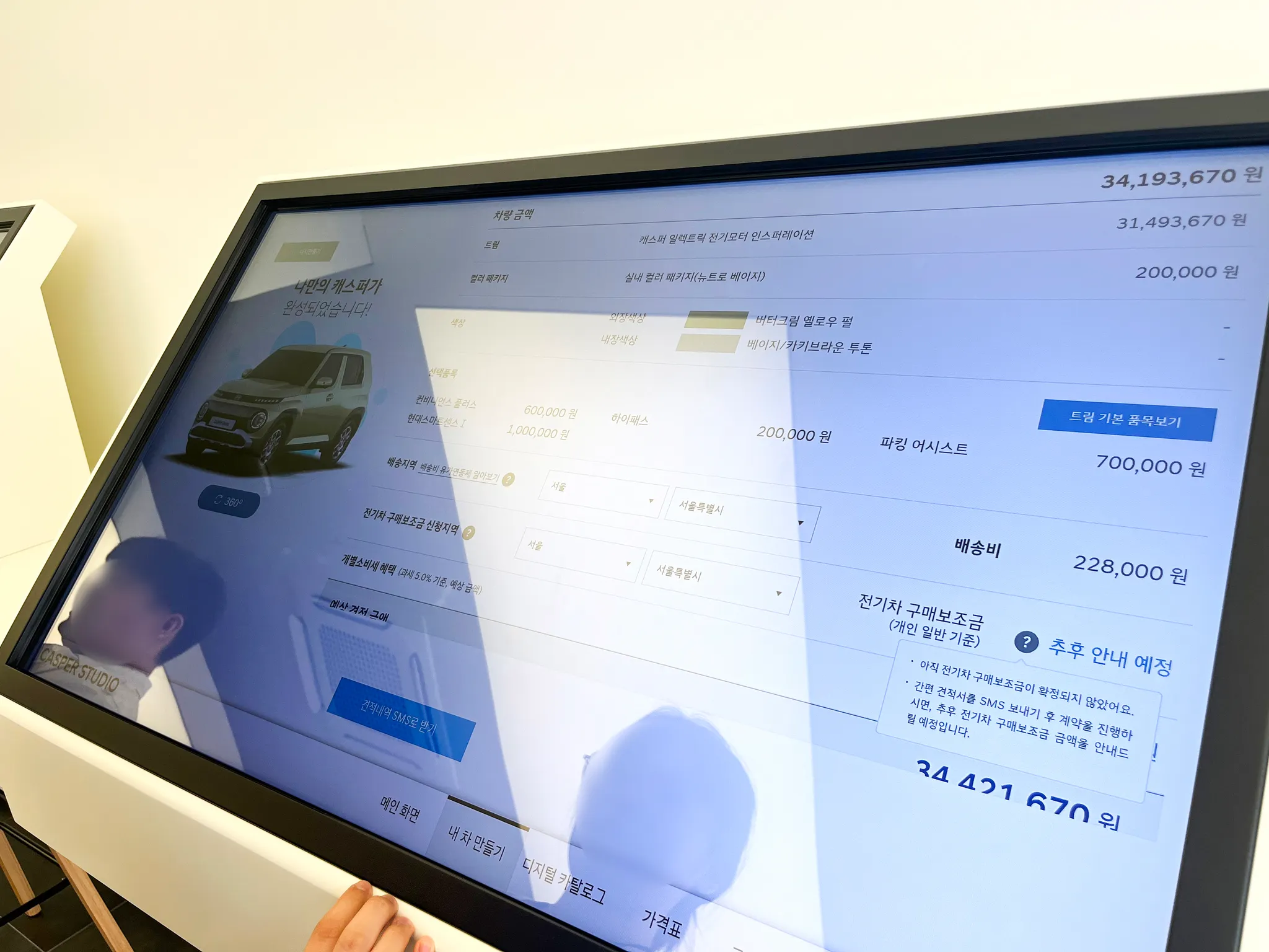 촬영 시기 상 보조금은 반영되지 않은 모습이에요. 내가 원하는 옵션을 골라 넣었을 때 얼마인지도 간편하게 볼 수 있는데요. 전시 공간 바로 옆의 캐스퍼 커넥터 존에서 직접 견적을 내볼 수 있습니다.